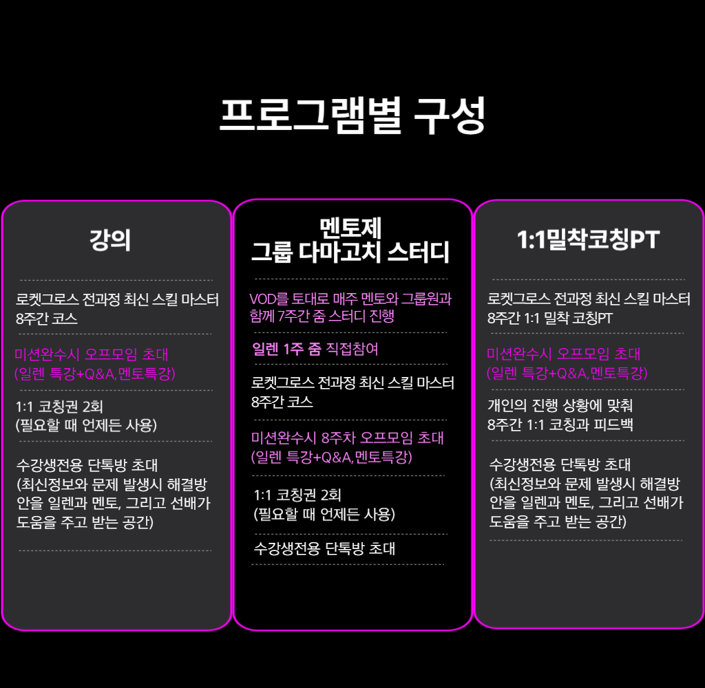 - 기수제 운영: 8주간의 미션 수행과 피드백을 통해 지속적인 학습을 도와 드립니다.