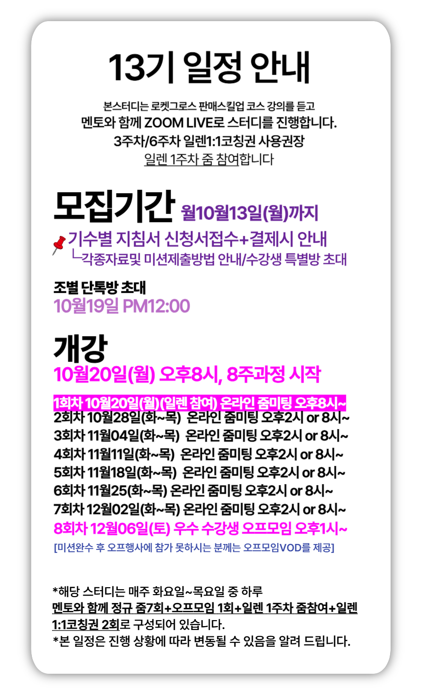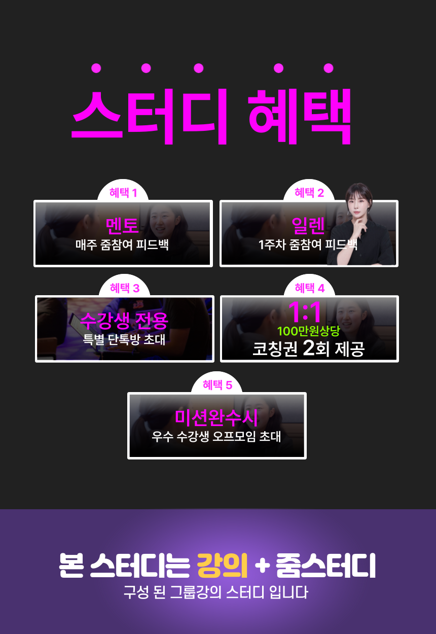 - 이 모임은 강사님과 열심히 하는 동기들과의 교류를 통해 한 단계 더 성장할 수 있는 터닝포인트가 될 것입니다.